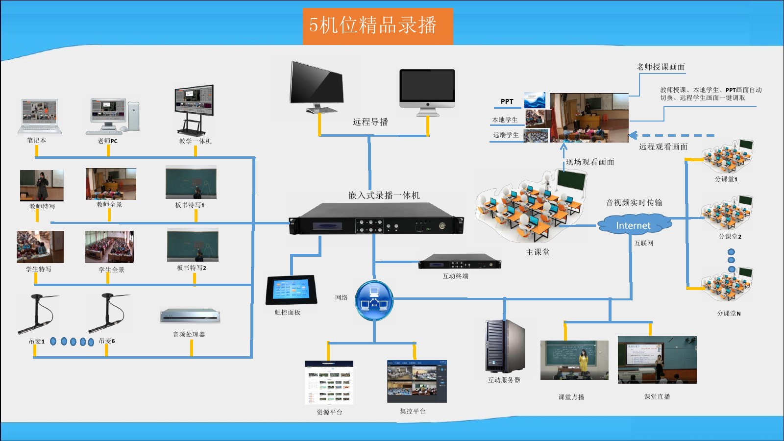 自主研發的錄播主機,內置互動模塊,一臺錄播機即可完成課程錄制,互動課堂的功能。實現不教室上同上一堂課的教學目的。