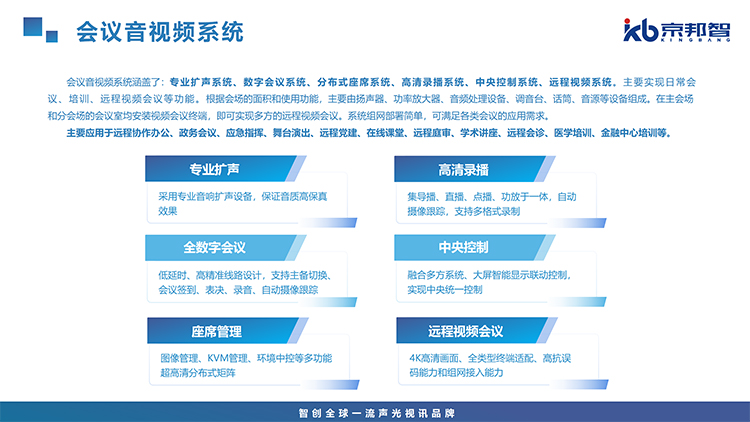 專業擴聲系統簡單來說就是把聲音信號放大,主要由聲源、音頻處理設備、功放及揚聲器系統組成。通過計算會議室的音響場地系數進行設計,保證會議室每個角落的聲場聽覺均勻,音響效果達到語言清晰、無失真、聲場分布均勻。
