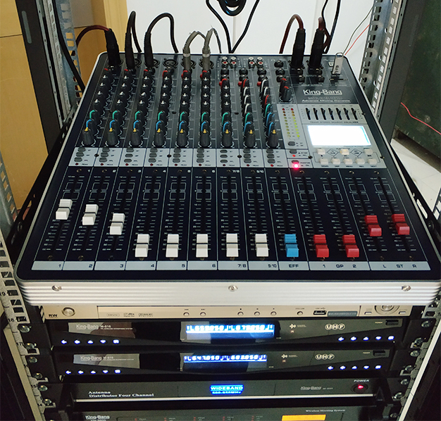 音頻環境的建立離不開電聲設備,它由以下四個部分組成:聲源設備——指拾音設備、影音信號播放設備如:拾音話筒、CD、MD、DAT、DVD等設備;調控設備——指對聲源設備送出的音頻信號等多路的音頻信號進行前級的放大和混音輸出、音頻信號處理的設備,如:調音臺、
