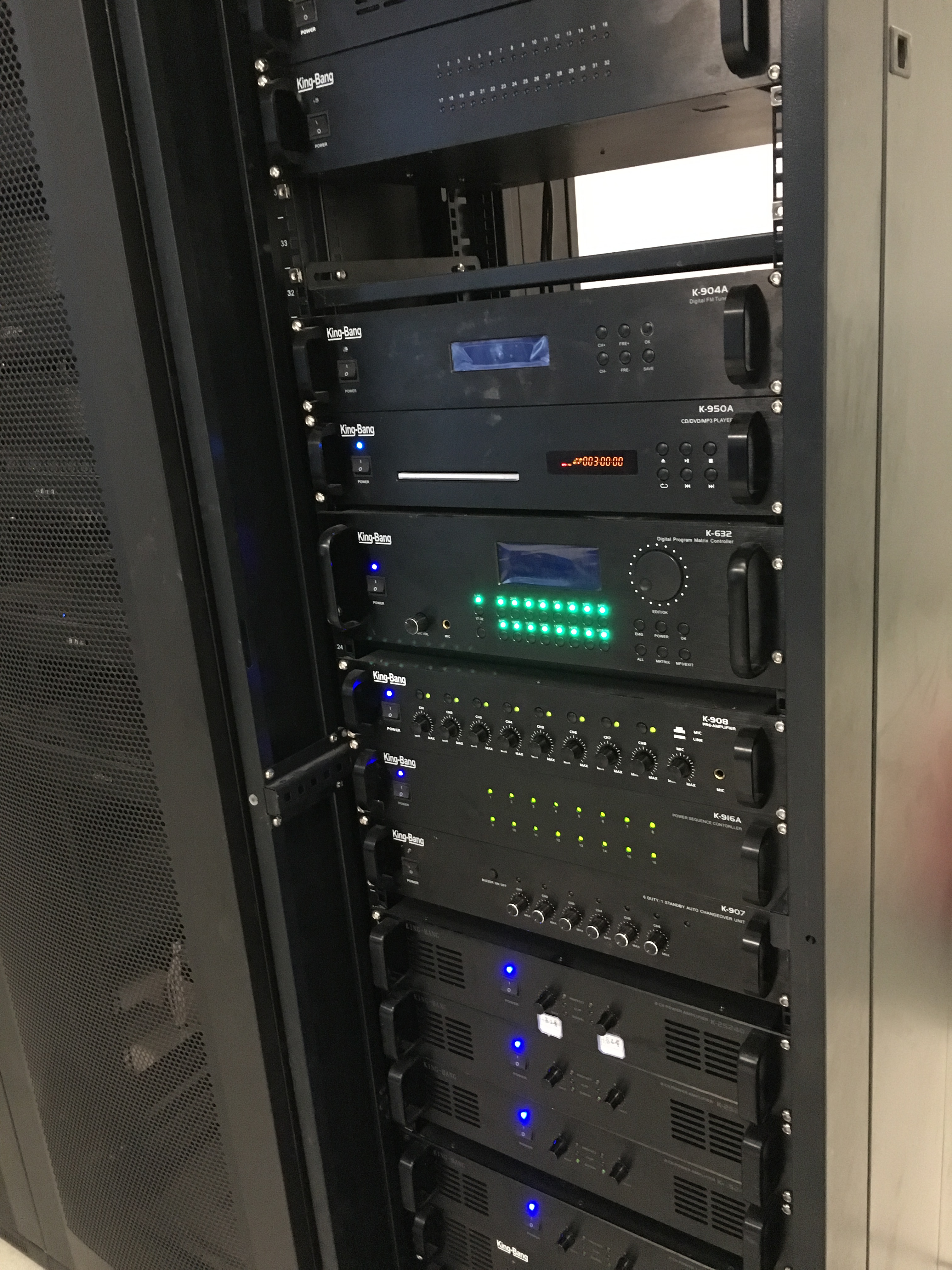 該項目共配置了1套智能廣播系統(tǒng),由控制中心同時控制博物館所有區(qū)域的背景音樂、定時打鈴、尋呼廣播等功能。京邦電子(KING-BANG)廣播系統(tǒng)是集播放、智能定時控制、遠程尋呼、智能消防聯(lián)動等功能于一身的公共廣播系統(tǒng)。