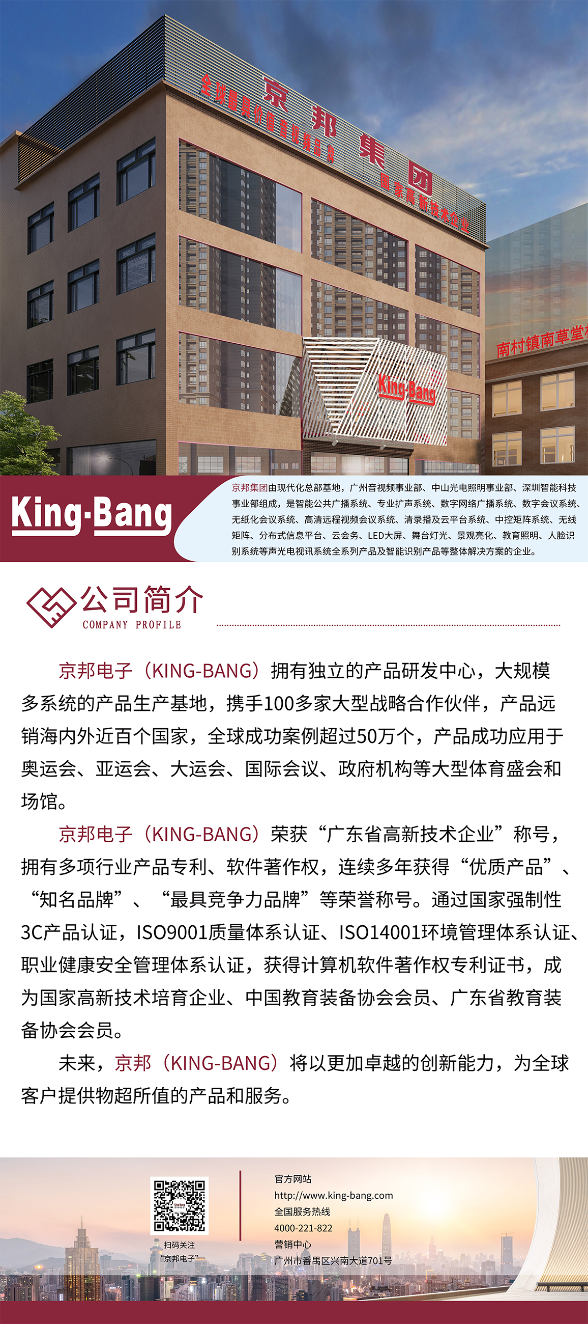 廣東京邦智慧科技集團有限公司自成立以來,一直專注于數字音視頻技術的研發和應用,不斷提升自身技術水平和創新能力。經過多年的努力,公司已經發展成為國內數字音視行業的領軍企業,產品和服務覆蓋了會議、公共廣播、擴音等多個領域。